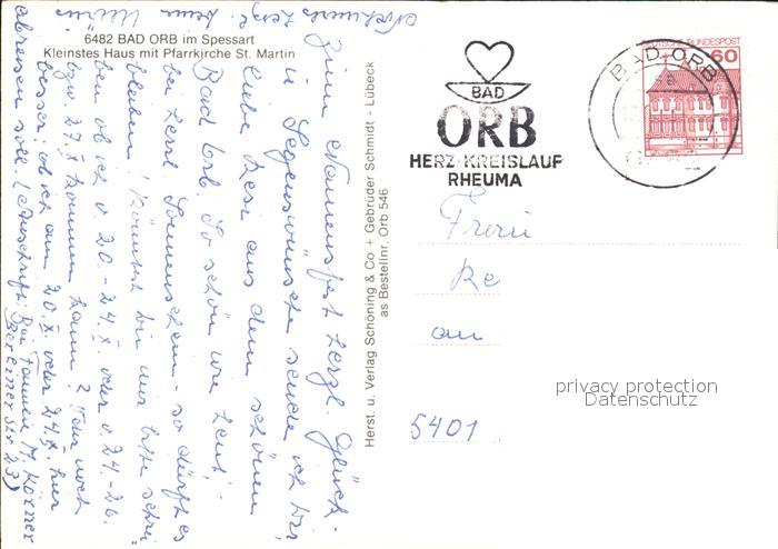72552636 alte Postkarte Bad Orb Kleinstes Haus mit Pfarrkirche St Martin postalisch gelaufen Erhaltung siehe scans [WerneD78] KatCode: 11110006435001