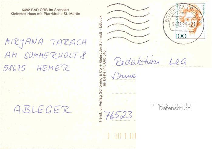 72725402 alte Postkarte Bad Orb Kleinstes Haus mit Pfarrkirche St Martin Fachwerk postalisch gelaufen Erhaltung siehe scans [FriedD77] KatCode: 11110006435001