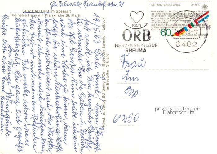 73270779 alte Postkarte Bad Orb Kleinstes haus Pfarrkirche Sankt Martin postalisch gelaufen Erhaltung siehe scans [KathaD81] KatCode: 11110006435001