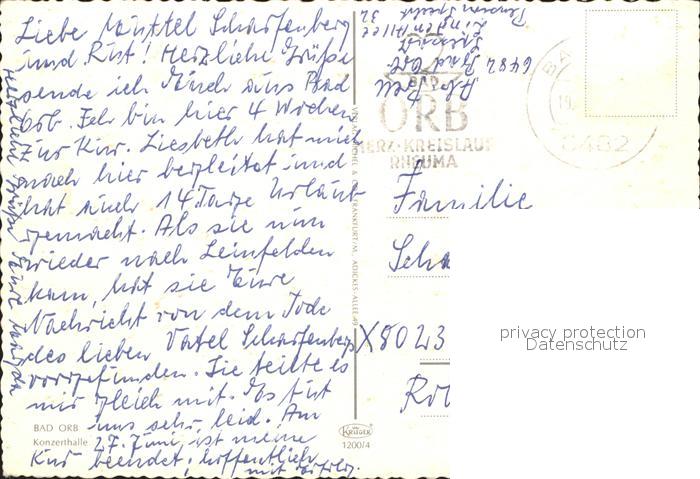 72369858 alte Postkarte Bad Orb Konzerthalle postalisch gelaufen Erhaltung siehe scans KatCode: 11110006435001