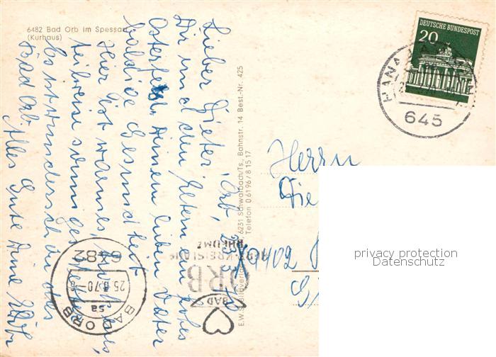 73837520 alte Postkarte Bad Orb Kurhaus postalisch gelaufen Erhaltung siehe scans [FriedD77] KatCode: 11110006435001