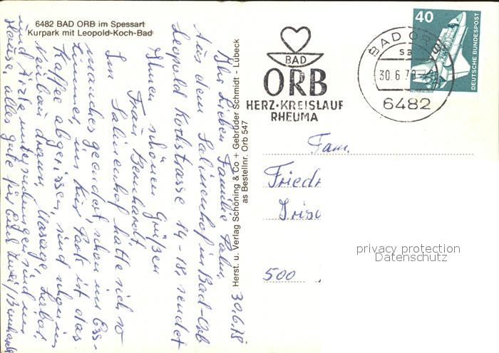 72548319 alte Postkarte Bad Orb Kurpark mit Leopold Koch Bad postalisch gelaufen Erhaltung siehe scans [LiesaD40 kv019box] KatCode: 11110006435001