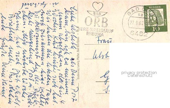 72924980 alte Postkarte Bad Orb Marktbrunnen Wendelinusbrunnen Fachwerkhaeuser Kleinstes Haus Kirchgasse Meisterhaus Malerischer Winkel Obertor St Martinskirche Wartturm postalisch gelaufen Erhaltung siehe scans [WerneD78] KatCode: 11110006435001