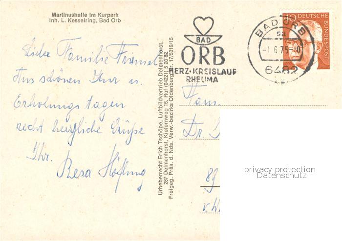 73719887 alte Postkarte Bad Orb Martinushalle im Kurpark Fliegeraufnahme postalisch gelaufen Erhaltung siehe scans [WerneD78] KatCode: 11110006435001