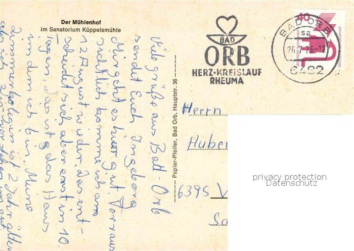 72918022 alte Postkarte Bad Orb Muehlenhof Sanatorium Kueppelsmuehle postalisch gelaufen Erhaltung siehe scans [KathaD81] KatCode: 11110006435001