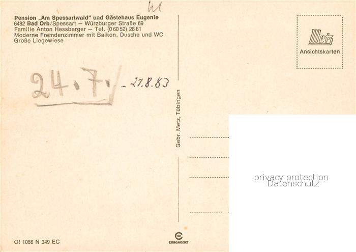 73845158 Bad Orb Pension Am Spessartwald und Gaestehaus Eugenie postalisch nicht gelaufen Erhaltung siehe scans [WerneD78] KatCode: 11110006435001