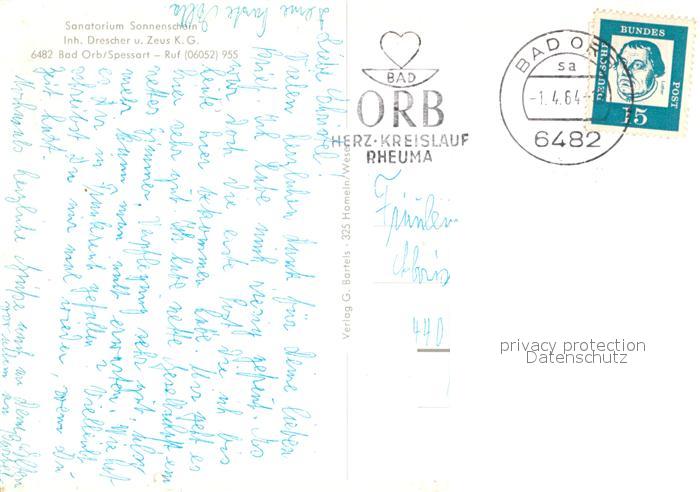 72959912 alte Postkarte Bad Orb Sanatorium Sonnenschein postalisch gelaufen Erhaltung siehe scans [WerneD78] KatCode: 11110006435001