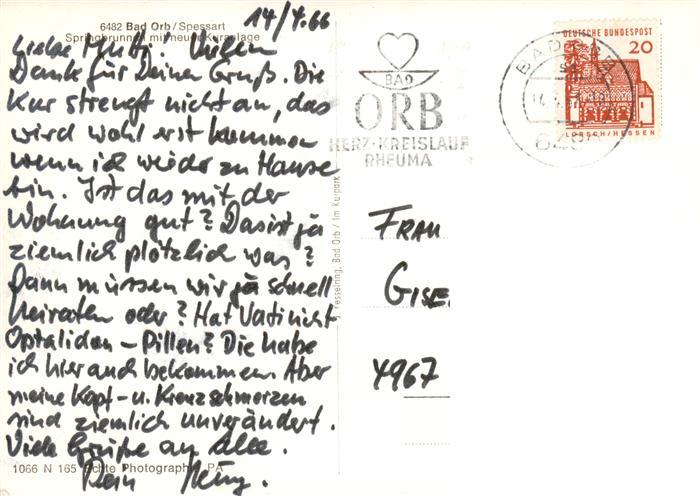 73877466 alte Postkarte Bad Orb Springbrunnen mit der neuen Kuranlage postalisch gelaufen Erhaltung siehe scans [WerneD78] KatCode: 11110006435001
