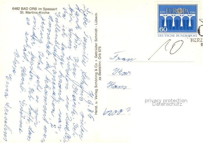 73203919 alte Postkarte Bad Orb St. Martins-Kirche postalisch gelaufen Erhaltung siehe scans [PaolaD17] KatCode: 11110006435001