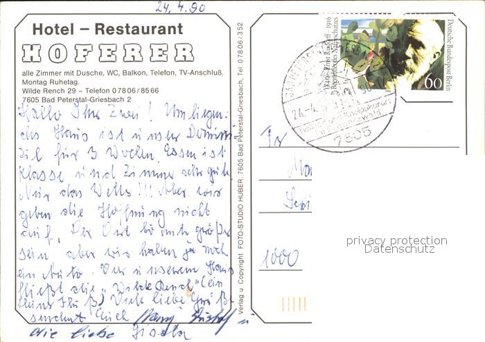 alte Postkarte Bad Peterstal-Griesbach Hotel Restaurant Hoferer postalisch gelaufen Erhaltung siehe scans