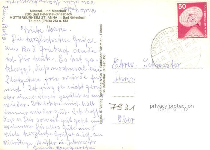 73654872 alte Postkarte Bad Peterstal-Griesbach Muetterkurheim St Anna postalisch gelaufen Erhaltung siehe scans [WerneD78] KatCode: 11110008317008
