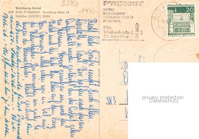73870796 alte Postkarte Bad Pyrmont Bomberg Hotel Gastraeume postalisch gelaufen Erhaltung siehe scans [WerneD78] KatCode: 11110003252003