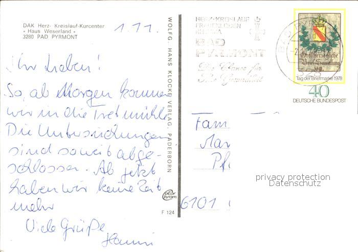 alte Postkarte Bad Pyrmont DAK Herz Kreislauf Kurcenter Haus Weserland Blumen postalisch gelaufen Erhaltung siehe scans