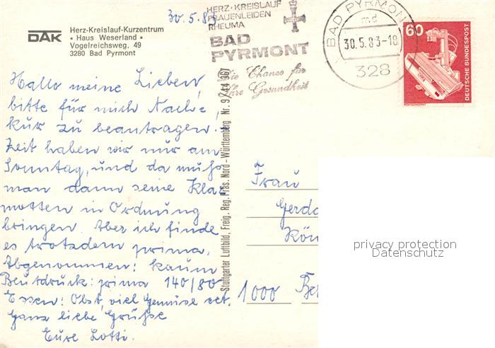 73088609 alte Postkarte Bad Pyrmont Fliegeraufnahme Herz-Kreislauf-Kurzentrum Haus Weserland postalisch gelaufen Erhaltung siehe scans [NatalD47] KatCode: 11110003252003