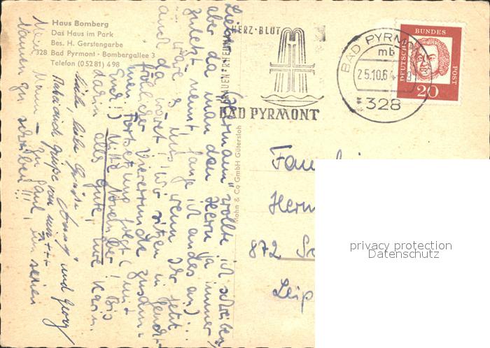 72227582 alte Postkarte Bad Pyrmont Haus Bomberg Pension postalisch gelaufen Erhaltung siehe scans KatCode: 11110003252003