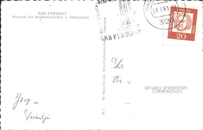 72081801 alte Postkarte Bad Pyrmont Kurpark mit Borkenhaeuschen und Gaenseliesel Teich postalisch gelaufen Erhaltung siehe scans KatCode: 11110003252003