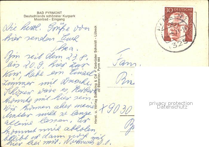 72447806 alte Postkarte Bad Pyrmont Kurpark Moorbad postalisch gelaufen Erhaltung siehe scans KatCode: 11110003252003
