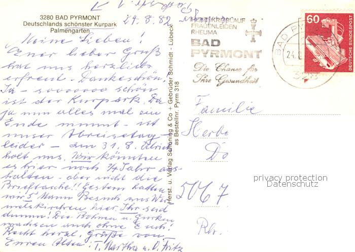 73018363 alte Postkarte Bad Pyrmont Palmengarten postalisch gelaufen Erhaltung siehe scans [WerneD78] KatCode: 11110003252003