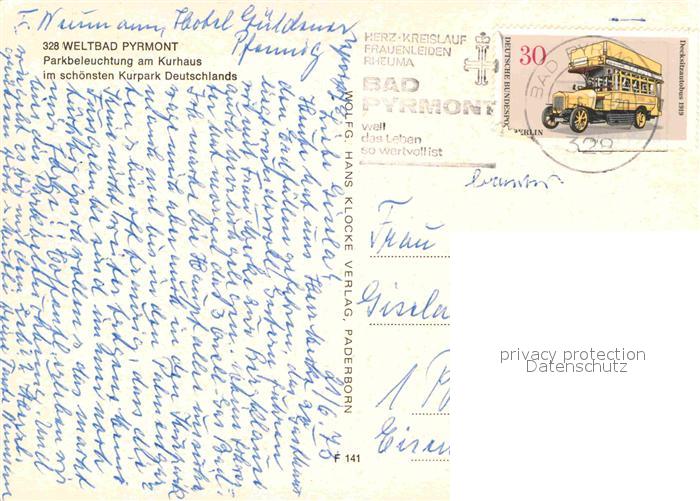 72823409 alte Postkarte Bad Pyrmont Parkbeleuchtung am Kurhaus Kurpark postalisch gelaufen Erhaltung siehe scans [FriedD77] KatCode: 11110003252003
