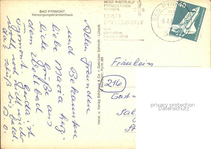 72281641 alte Postkarte Bad Pyrmont Versorgungskrankenhaus postalisch gelaufen Erhaltung siehe scans KatCode: 11110003252003