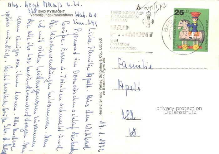 72000186 alte Postkarte Bad Pyrmont Versorgungskrankenhaus postalisch gelaufen Erhaltung siehe scans KatCode: 11110003252003