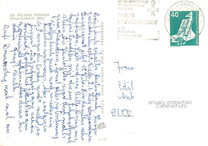 72943865 alte Postkarte Bad Pyrmont Weser Kurklinik postalisch gelaufen Erhaltung siehe scans [KathaD81] KatCode: 11110003252003