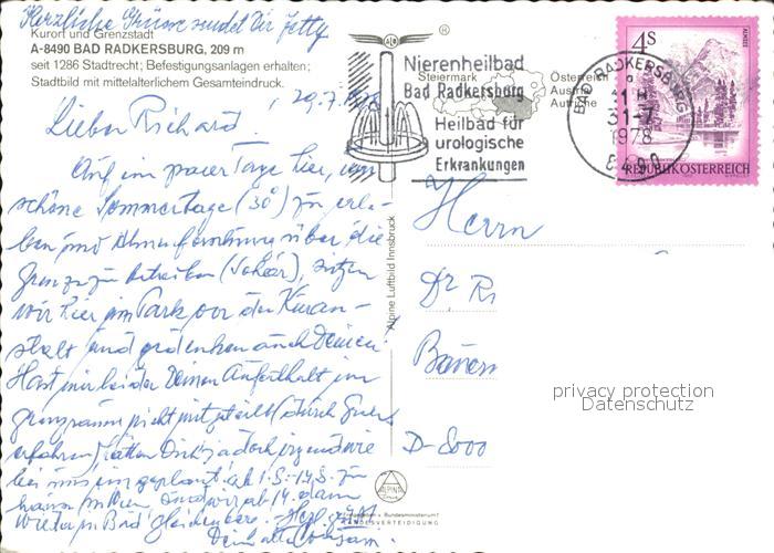 72592600 alte Postkarte Bad Radkersburg Fliegeraufnahme postalisch gelaufen Erhaltung siehe scans [FriedD77] KatCode: 11390224061513