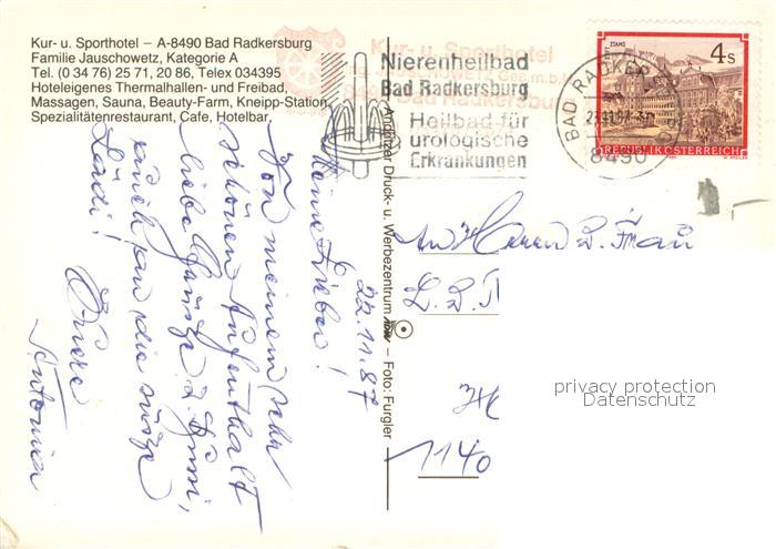 73652251 alte Postkarte Bad Radkersburg Kur- und Sporthotel Restaurant Hallenbad Swimming Pool Fliegeraufnahme postalisch gelaufen Erhaltung siehe scans [FriedD77] KatCode: 11390224061513