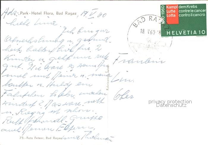11646293 alte Postkarte Bad Ragaz Ragatz Park Hotel Flora postalisch gelaufen Erhaltung siehe scans KatCode: 11470190565614