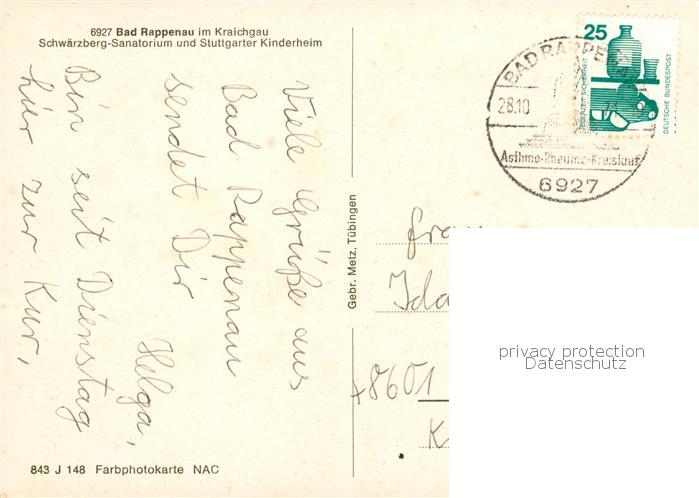 73840630 alte Postkarte Bad Rappenau Schwaerzberg-Sanatorium und Stuttgarter Kinderheim postalisch gelaufen Erhaltung siehe scans [FriedD77] KatCode: 11110008125006