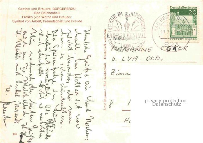 74013716 alte Postkarte BAD REICHENHALL Gasthof Brauerei Buergerbraeu Fresko von Wothe und Braeuer Symbol von Arbeit Freundschaft und Freude postalisch gelaufen Erhaltung siehe scans [FriedD77] KatCode: 11110009172114