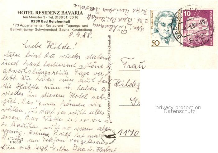 73086661 alte Postkarte Bad Reichenhall Hotel Bavaria postalisch gelaufen Erhaltung siehe scans [NatalD47] KatCode: 11110009172114