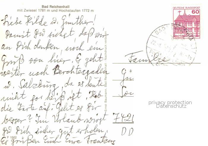 72859292 alte Postkarte Bad Reichenhall mit Zwiesel und Hochstaufen postalisch gelaufen Erhaltung siehe scans [WerneD78] KatCode: 11110009172114