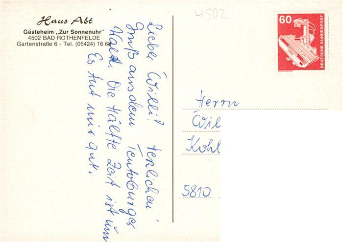 73895099 Bad Rothenfelde Haus Abt Gaesteheim Zur Sonnenuhr postalisch nicht gelaufen Erhaltung siehe scans [WerneD78] KatCode: 11110003459006