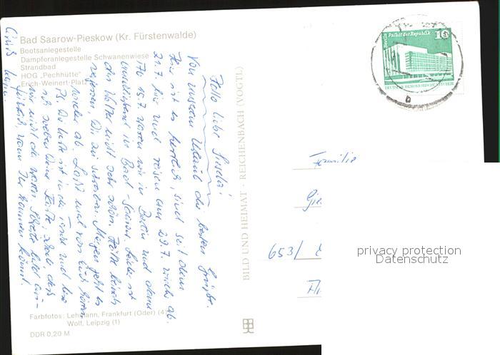 72544759 alte Postkarte Bad Saarow-Pieskow Anlegestelle Schwanenwiese HOG Pechhuette Erich-Weinert-Platz postalisch gelaufen Erhaltung siehe scans [NatalD47 kv014box] KatCode: 11110012067024