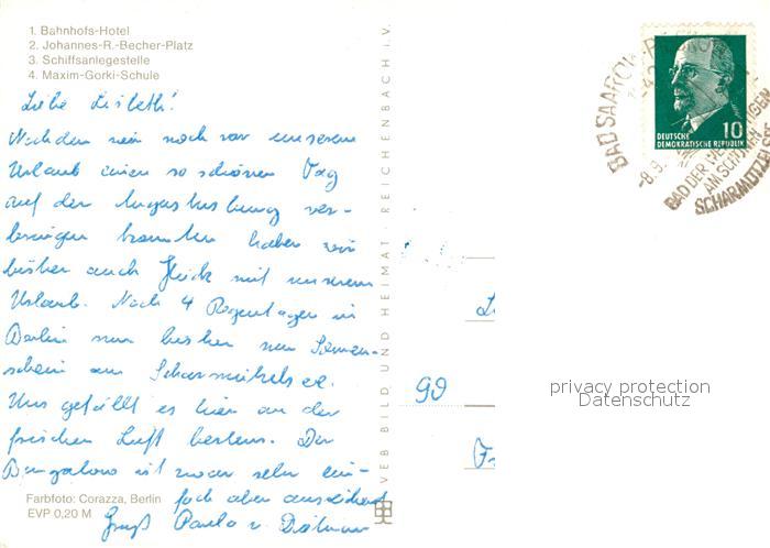 73041610 alte Postkarte Bad Saarow-Pieskow Bahnhofshotel Johannes R Becher Platz Schiffsanlegestelle Maxim Gorki Schule postalisch gelaufen Erhaltung siehe scans [FriedD77] KatCode: 11110012067024
