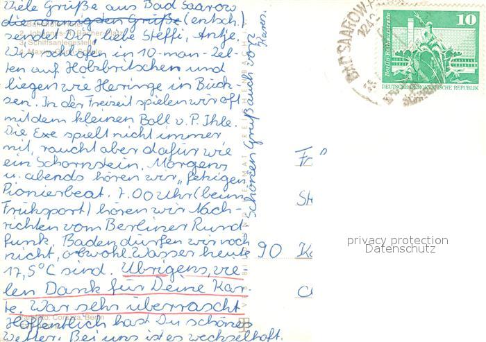 73041606 alte Postkarte Bad Saarow-Pieskow Bahnhofshotel Johannes R Becher Platz Schiffsanlegestelle Maxim Gorki Schule postalisch gelaufen Erhaltung siehe scans [FriedD77] KatCode: 11110012067024