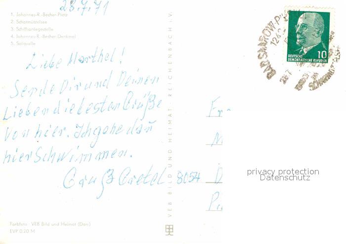 72624784 alte Postkarte Bad Saarow-Pieskow Johannes Becher Platz und Denkmal Scharmuetzelsee Schiffsanlegestelle Solquelle postalisch gelaufen Erhaltung siehe scans [WerneD78] KatCode: 11110012067024