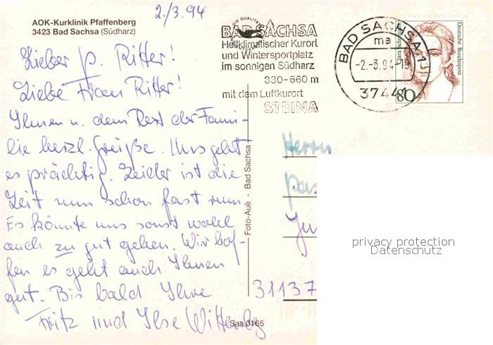 72784732 alte Postkarte Bad Sachsa Harz AOK Kurklinik Pfaffenberg postalisch gelaufen Erhaltung siehe scans [LiesaD40] KatCode: 11110003156003