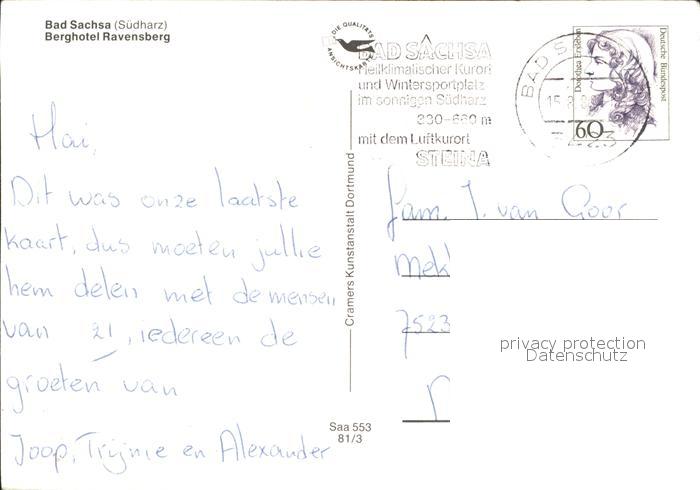72326904 alte Postkarte Bad Sachsa Harz Berghotel Ravensberg postalisch gelaufen Erhaltung siehe scans KatCode: 11110003156003