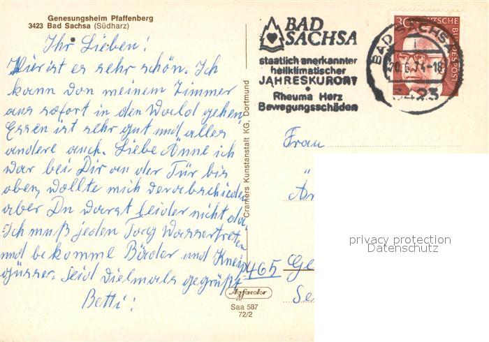 73653992 alte Postkarte Bad Sachsa Harz Genesungsheim Pfaffenberg postalisch gelaufen Erhaltung siehe scans [FriedD77] KatCode: 11110003156003