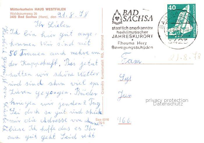 73081732 alte Postkarte Bad Sachsa Harz Haus Westfalen Muetterkurheim postalisch gelaufen Erhaltung siehe scans [LiesaD40] KatCode: 11110003156003