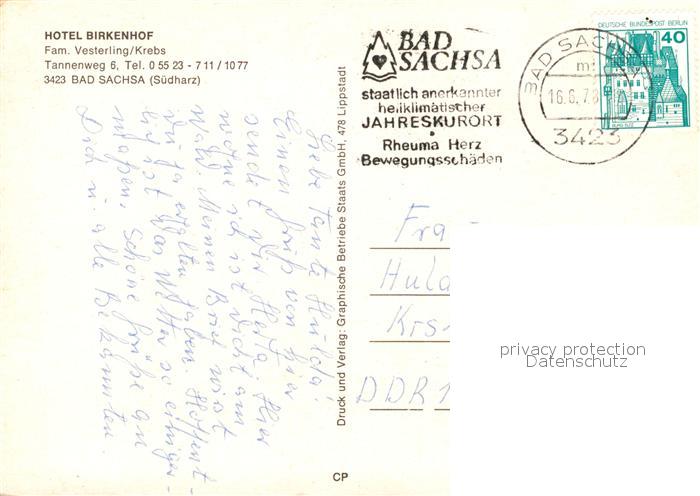 73104862 alte Postkarte Bad Sachsa Harz Hotel Birkenhof postalisch gelaufen Erhaltung siehe scans [WerneD78] KatCode: 11110003156003