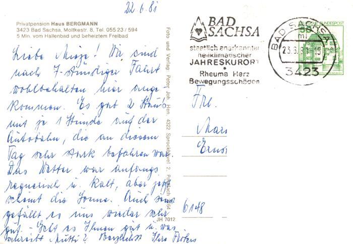 73949375 alte Postkarte Bad Sachsa Harz Privatpension Haus Bergmann postalisch gelaufen Erhaltung siehe scans [WerneD78] KatCode: 11110003156003