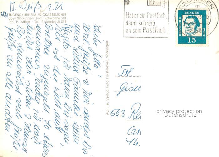 73644496 alte Postkarte Bad Saeckingen Jugendkurheim Wickartsmuehle im Schwarzwald postalisch gelaufen Erhaltung siehe scans [FriedD77] KatCode: 11110008337096
