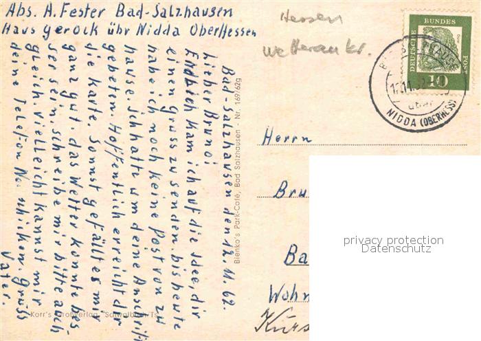 72914800 alte Postkarte Bad Salzhausen Kuranlagen Saline Milchbar Barockhaeuschen postalisch gelaufen Erhaltung siehe scans [FriedD77] KatCode: 11110006440016