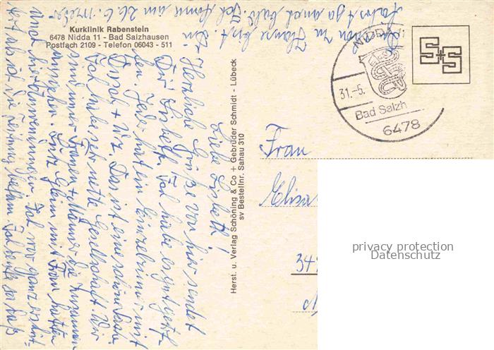 74085241 alte Postkarte Bad Salzhausen Nidda Kurklinik Rabenstein postalisch gelaufen Erhaltung siehe scans [WerneD78] KatCode: 11110006440016