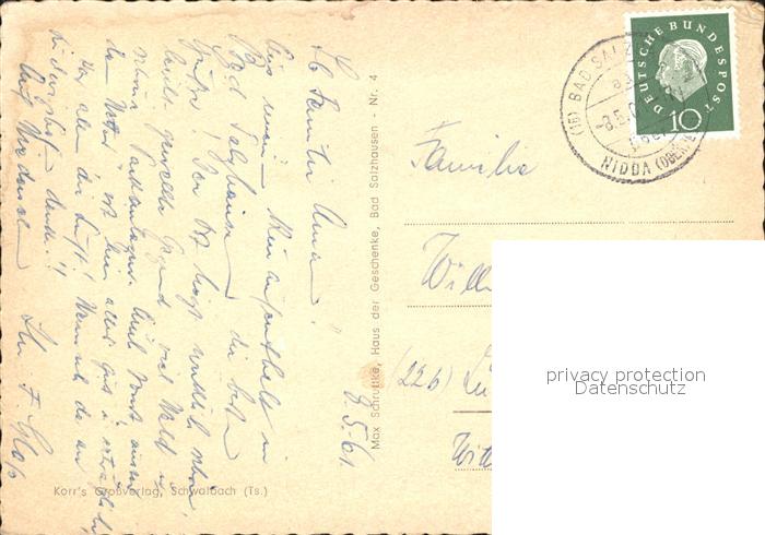 72276895 alte Postkarte Bad Salzhausen Saline Kurhaus Barockhaeuschen Hotel-Tannenhof Haus-Siegfried postalisch gelaufen Erhaltung siehe scans KatCode: 11110006440016