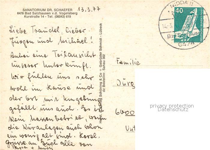 73121221 alte Postkarte Bad Salzhausen Sanatorium Dr. Schaefer postalisch gelaufen Erhaltung siehe scans [LiesaD40] KatCode: 11110006440016