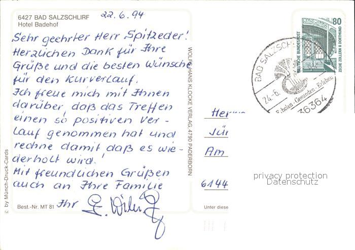 72492889 alte Postkarte Bad Salzschlirf Hotel Badehof postalisch gelaufen Erhaltung siehe scans KatCode: 11110006631001